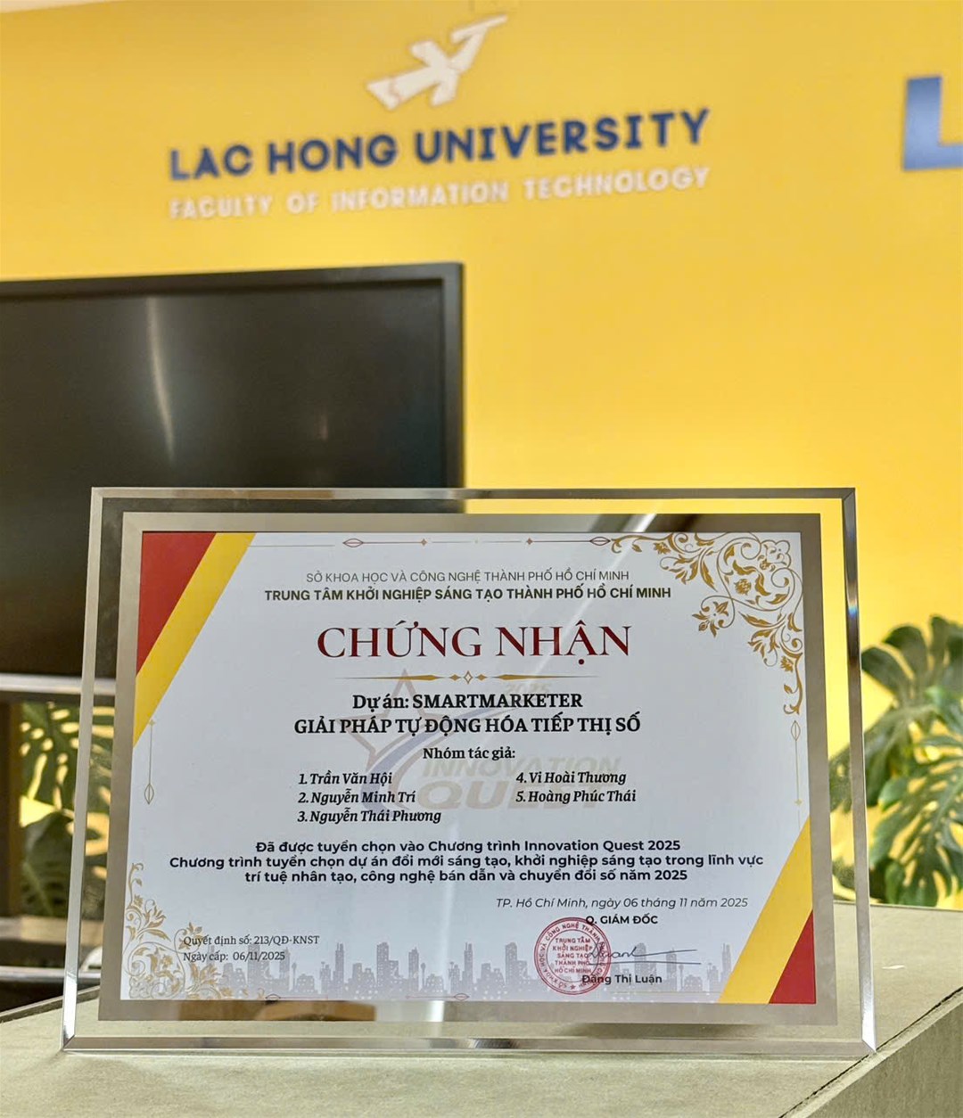 Sinh viên Khoa Công nghệ Thông tin – Trường Đại học Lạc Hồng đã thể hiện năng lực nổi bật khi đội SmartMarketer tham gia Vòng Tranh đấu Innovation Quest 2025 diễn ra ngày 23/10/2025 tại SIHUB. Trên sân khấu công nghệ chuyên nghiệp, các bạn sinh viên đã trình bày giải pháp Tự động hóa Tiếp thị Số bằng AI với phong thái tự tin, nội dung rõ ràng và khả năng ứng dụng cao. Prototype hoạt động thực tế cùng phần phản biện vững vàng trước các câu hỏi chuyên sâu đã cho thấy sự chuẩn bị kỹ lưỡng và khả năng làm chủ kiến thức của sinh viên LHU.