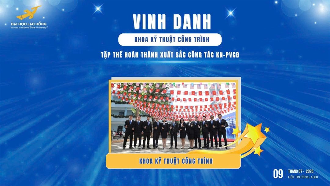 Khoa Kỹ thuật Công trình tiếp tục khẳng định vị thế dẫn đầu khi được vinh danh là đơn vị có thành tích xuất sắc trong công tác quản lý và hỗ trợ hoạt động Khoa học Công nghệ. Nhiều đề tài nghiên cứu thực tiễn của giảng viên và sinh viên đã được ứng dụng, khẳng định giá trị trí tuệ và tính ứng dụng cao của Khoa.