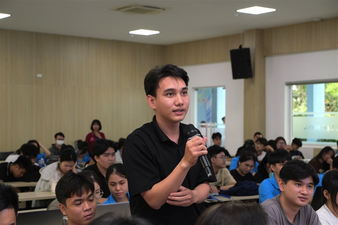 Các bạn sinh viên chủ động đặt nhiều câu hỏi thú vị cho diễn giả, bày tỏ tinh thần ham học hỏi, cầu tiến và quan tâm sâu sắc đến xu hướng thương mại điện tử, cho thấy sự chủ động trong việc tìm hiểu và tiếp cận thực tế ngành nghề tương lai.
