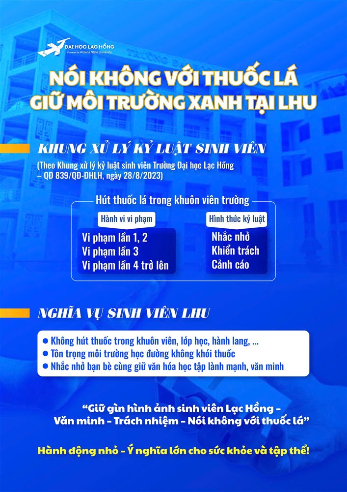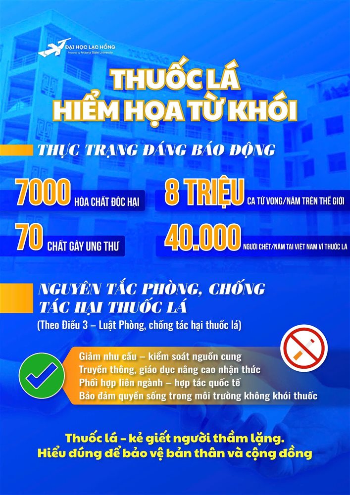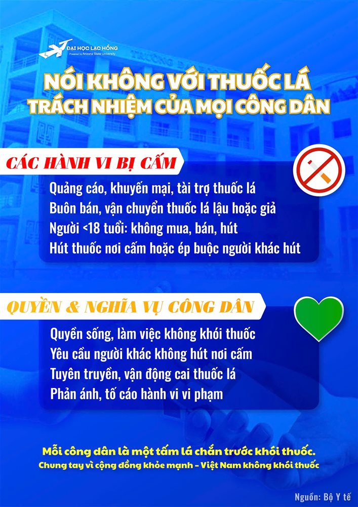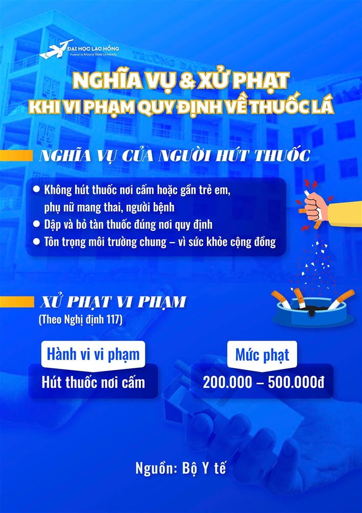 In alignment with Circular No. 11/2023/TT-BYT issued by the Ministry of Health on May 11, 2023, Lac Hong University strictly enforces a Smoke-Free Campus Policy.